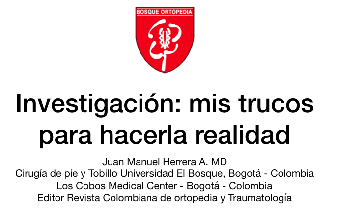 • 48vo Congreso Nacional SCCOT. Litotripcia Extracorporea con Ondas de Choque en el manejo de Fracturas por Stress de la Tibia en Deportistas. Bogotá, Abril 30 – Mayo 3 del 2003 • 48vo Congreso Nacional SCCOT. Litotripcia Extracorporea con Ondas de Choque para el aflojamiento de las interfases Cemento – Hueso, Cemento – Prótesis. Un modelo Experimental en Cadáveres. Bogotá, Abril 30 – Mayo 3 de 2003 - IV Curso Bienal de Ciencias Básicas. Sociedad Colombiana de Cirugía Ortopédica y Traumatología. Biología Molecular del Condrocito. Bogotá, Agosto 15 – 16 de 2003. - Conceptos Actuales en rehabilitación de Hombro. ASCOFI. Litotripcia Extracorporea con Ondas de choque para el manejo de la tendinitis calcificada del hombro. Bogota, Marzo 26 de 2004 • - 49VO Congreso Nacional SCCOT. Litotripcia extracorporea con Ondas de Choque en medicina deportiva. Cartagena. Abril 28 - Mayo1 de 2004. • Técnicas ortopedicas del Futuro. Bienal Bosque Ortopedia. Factores de crecimiento autologos en Ortopedia. Bogota, Julio 30-31 de 2004. • VIII Curso de Actualizacion en Ortopedia y Traumatología Colsanitas – Sociedad Colombiana de Cirugía Ortopédica y Traumatología. Ondas de Choque y Biocirugia en el manejo de la Epicondilitis. Bogotá, Noviembre 5-6 de 2004. • 50vo Congreso de la Sociedad Chilena de Medicina Deportiva y 2do Congreso Latinoamericano de Traumatología Deportiva. Factores de Crecimiento Autólogos en Cirugía Artroscópica de Rodilla. Santiago – Chile. Julio 22 de 2005. • 50vo Congreso de la Sociedad Chilena de Medicina Deportiva y 2do Congreso Latinoamericano de Traumatología Deportiva. Estado actual de las Ondas de Choque en Ortopedia Deportiva. Santiago – Chile. Julio de 2005. • 50vo Congreso de la Sociedad Chilena de Medicina Deportiva y 2do Congreso Latinoamericano de Traumatología Deportiva. Ondas de Choque en fracturas por Estrés. Santiago – Chile. Julio de 2005. • 50vo Congreso de la Sociedad Chilena de Medicina Deportiva y 2do Congreso Latinoamericano de Traumatología Deportiva. Retorno deportivo en Fracturas por Etrés. Santiago de Chile. Julio de 2005. • II Jornada de Actualización de Instrumentación Quirúrgica Fundación Tecnológica Autónoma de Bogota-Universidad de Santander. Bogotá. Octubre 29 de 2005. • PRIMER CONGRESO ECUATORIANO DE MEDICINA Y FUTBOL. FEDERACION ECUATORIANA DE FUTBOL. Lesiones de tobillo. Quito. Agosto 31 de 2006 • PRIMER CONGRESO ECUATORIANO DE MEDICINA Y FUTBOL. FEDERACION ECUATORIANA DE FUTBOL. Diagnostico de lesiones de hombro. Quito. Agosto 31 de 2006 • VI curso bienal Bosque Ortopedia. Universidad El Bosque. Artroplastia de Tobillo. Bogotá. Agosto 2007. • Capitulo de Pie y Tobillo. Sociedad Colombiana de Cirugía Ortopedica y Traumatologia. Biomecanica de las artroplastias de Tobillo. Bogotá. Noviembre 2007 • Curso de Ortopedia y Futbol II. Universidad El Bosque. Tendones biarticulares en el tobillo. El peligro de Infiltrarlos. Bogotá. Agosto 2008 • Sociedad Antioqueña de Ortopedia y traumatología. Curso estado del arte en protesis total de tobillo. Porque Sí Artroplastia de tobillo. Medellin. Agosto 23 de 2008 • Artroplastia de Tobillo. Jornadas Cientificas Hospital Metropolitano. Quito-Ecuador. Septiembre de 2008 • XIV Curso anual de actualización de residentes de Medicina Fisica y Rehabilitación. Rehabilitación Ortopedica. Universidad El Bosque. Bogotá. Septiembre de 2008 • En que estamos en el mundo de la Artroplastia de Tobillo. Jornadas Cientificas Hospital Metropolitano. Quito-Ecuador. Abril de 2009 • Indización de Revistas Médicas. 1er Encuentro Ibero Latino Americano de editroes de revistas de Ortopedia y Traumatología. Mayo de 2012. • La exogamia en las publicaciones médicas indizadas. 1er Encuentro Ibero Latino Americano de editroes de revistas de Ortopedia y Traumatología. Mayo de 2012. • Requerimientos editoriales para la indización de Revista Médicas. 1er Encuentro Ibero Latino Americano de editroes de revistas de Ortopedia y Traumatología. Mayo de 2012. • Clasificaciones en Pie diabético. Curso Bienal Bosque Ortopedia “Diego Jimenez”. Agosto de 2012 • Artroplastia de la articulacion Metatarso Falángica del Hallux. Curso Bienal Bosque Ortopedia “Diego Jimenez”. Agosto de 2012 • Conferencista Curso: La ortopedia para el Médico General “una Visión Práctica”. Sociedad Colombiana de Cirugía Ortopédica y Traumatología Seccional Capital. Octubre 20 de 2012 • Como publicar Artículos científicos. Encuentro nacional de residentes. Sociedad Colombiana de Cirugía Ortopédica y Traumatología. Bogotá, Noviembre de 2012. • Clasificación y biomecánica de las Artrosis de Tobillo. Curso de instrucción en reemplazos articulares. Sociedad Ecuatroiana de Ortopedia y Traumatología (SEOT). Quito-Ecuador, Abril de 2013 • Biomecánica de las Prótesis de Tobillo. Curso de instrucción en reemplazos articulares. Sociedad Ecuatroiana de Ortopedia y Traumatología (SEOT). Quito-Ecuador Abril de 2013 • Manejo postoperatorio de las artroplastias de tobillo. Curso de instrucción en reemplazos articulares. Sociedad Ecuatroiana de Ortopedia y Traumatología (SEOT). Quito-Ecuador Abril de 2013 • Nuevas tendencias en la instrumentación de las prótesis articulares de Tobillo. Curso de instrucción en reemplazos articulares. Sociedad Ecuatroiana de Ortopedia y Traumatología (SEOT). Quito-Ecuador Abril de 2013 • Reemplazo de la Articulación Metatarso Falángica del Hallux. Curso de instrucción en reemplazos articulares. Sociedad Ecuatroiana de Ortopedia y Traumatología (SEOT). Quito-Ecuador. Abril de 2013 • Profesor invitado. Como escribir literatura médica. XXVII Jornada Nacional de Ortopedia. 58 Reunion anual. Colegio Mexicano de Ortopedia y Traumatología AC. Acapulco – México. 1-5 de Mayo de 2013. • Profesor Invitado. Como Publicar un artículo científico. XXVII Jornada Nacional de Ortopedia. 58 Reunion anual. 